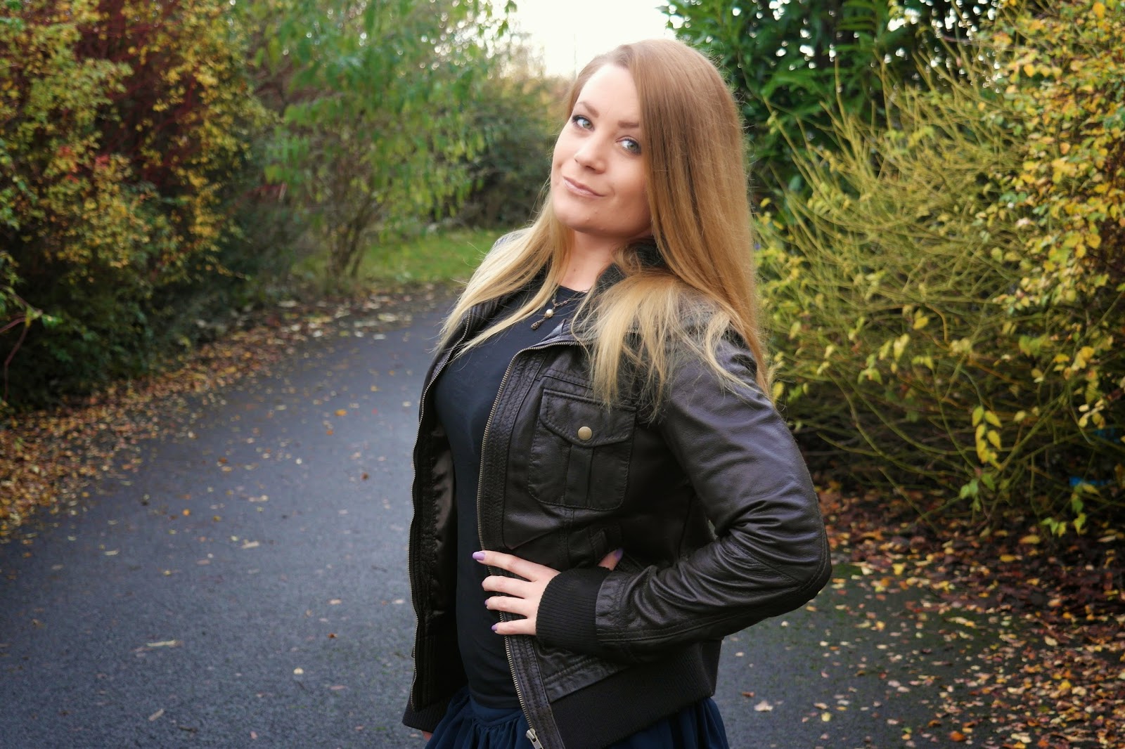 I'm matching my brown leather jacket with a dusky dark blue skirt from Primark, and a pair of thick knitted tights in beige - perfect for the colder seasons.